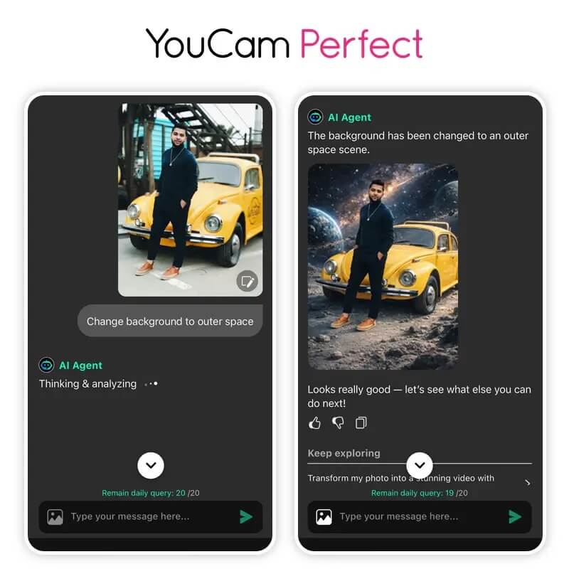 YouCam Perfect has evolved from a selfie editor into a powerhouse image AI editor. It was the most consistent performer in my tests, specifically because of its "AI Agent"—a feature that essentially acts as a human editor obeying your text commands.