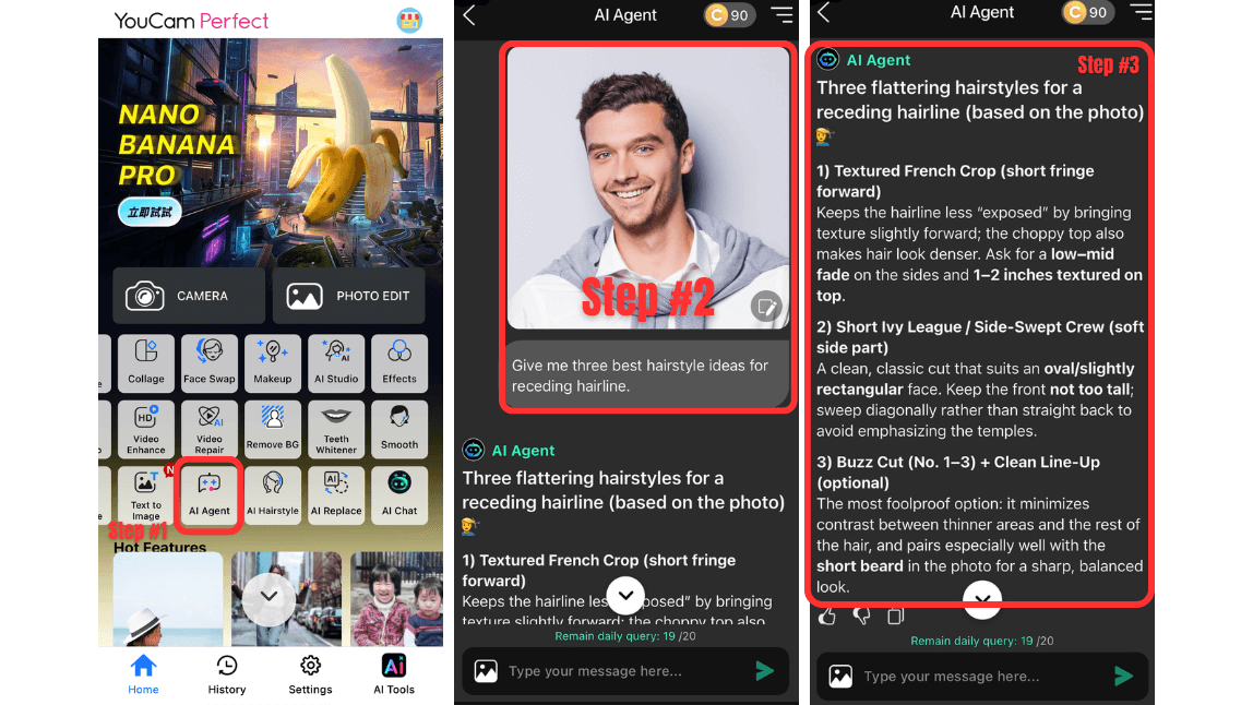 Try YouCam Perfect today and explore hundreds of haircuts virtually. Whether it’s a buzz cut, textured crop, or side part, AI Hairstyle and AI Agent will help you find the best haircut for your receding hairline—without leaving home. ✨