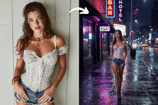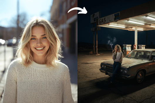 Example: A girl standing under a flickering streetlight in an empty parking lot, light rain falling, shot on film with heavy shadows, 90s indie drama vibes.