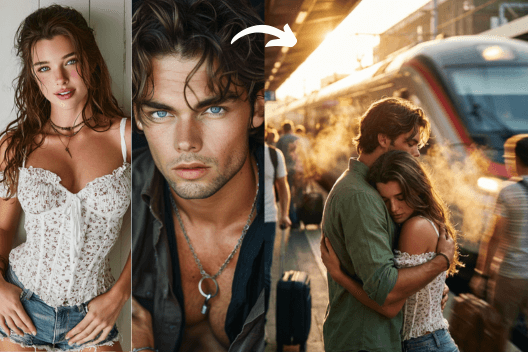 Prompt: Two people hug tightly on a train platform, surrounded by motion blur as the train arrives. Golden hour backlight. Heartbreaking in the best way.