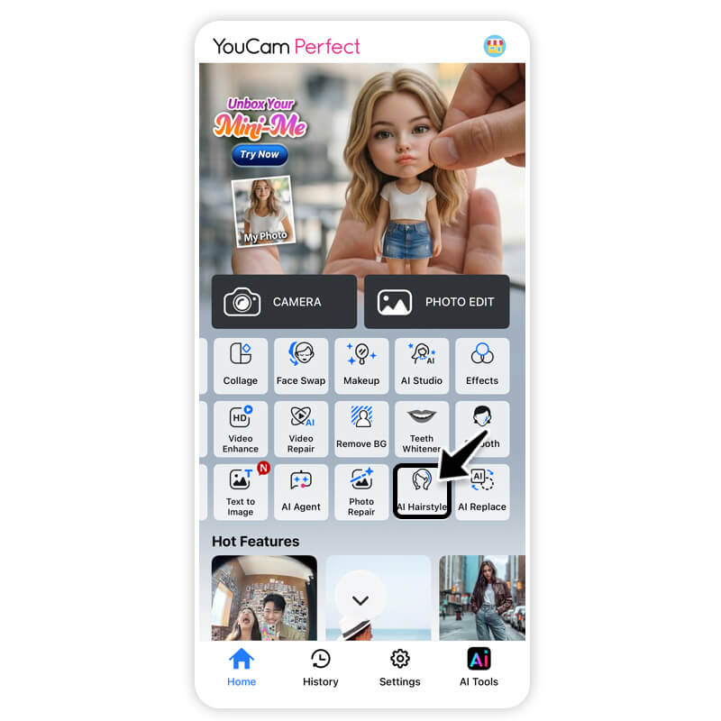 Download the YouCam Perfect app and tap AI Hairstyle.