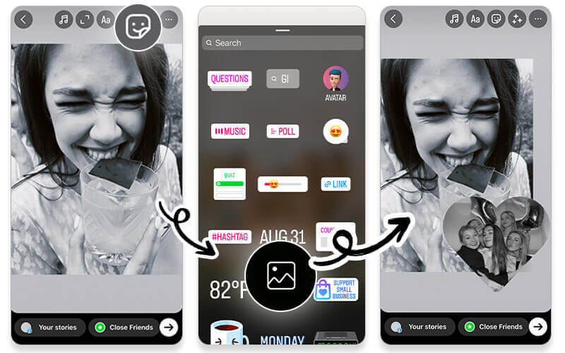 - Alternatively, use the "Sticker tool" (the square smiley face icon), scroll down, and select the "Photo Sticker" icon. Repeat this process to add and layer more photos from your camera roll!