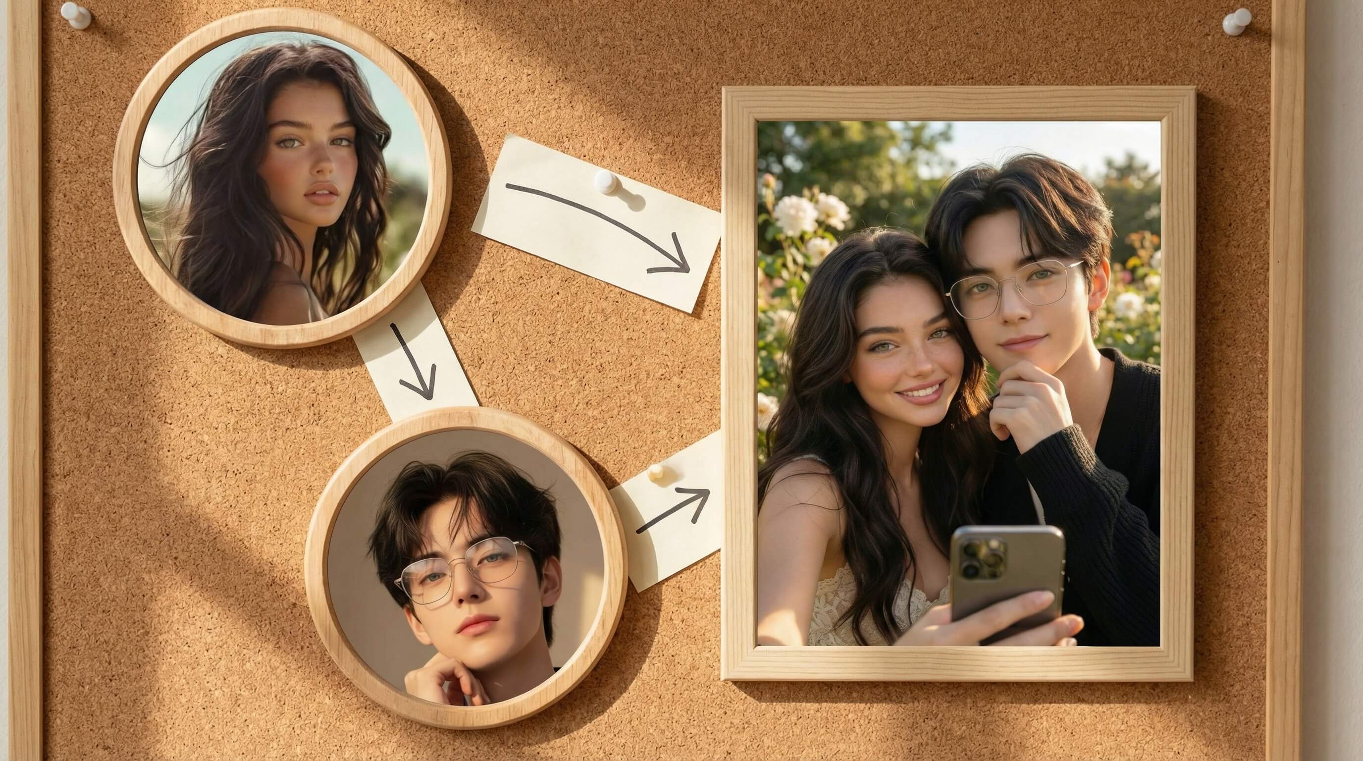 “Combine two people into a couple selfie, adjust posture, lighting, and facial expressions, keep the background clean and natural.”