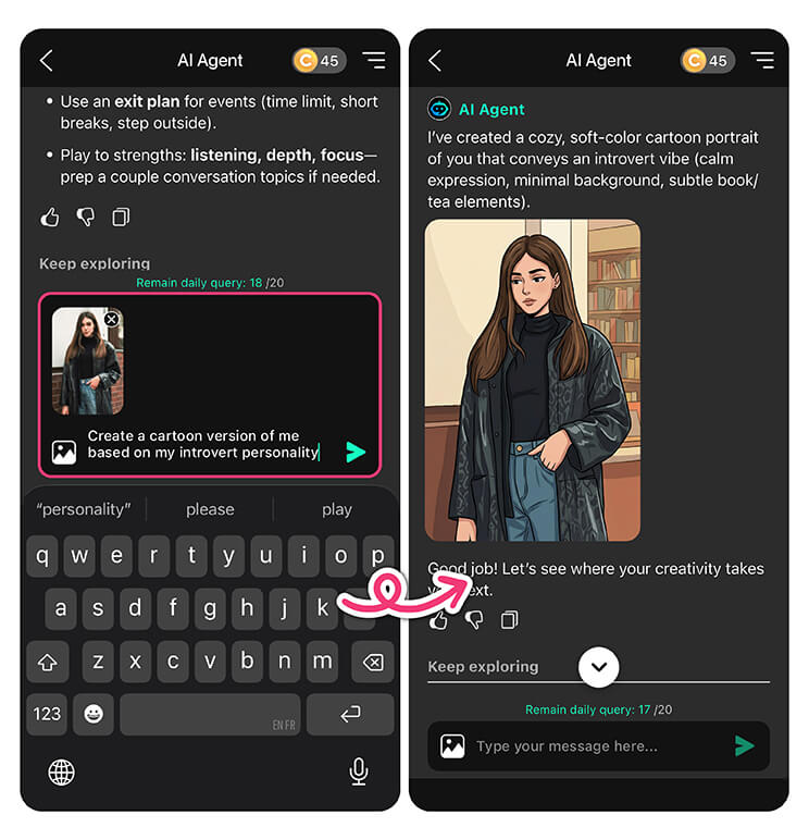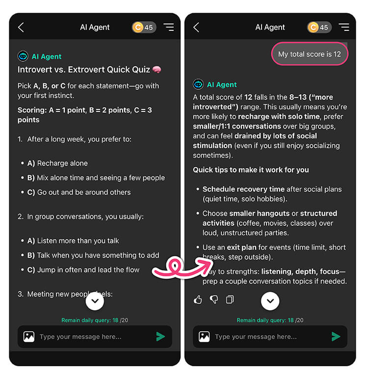 Instead of filling out static questionnaires, you can now take an introvert or extrovert quiz in a more interactive, creative way using YouCam Perfect’s AI Agent.