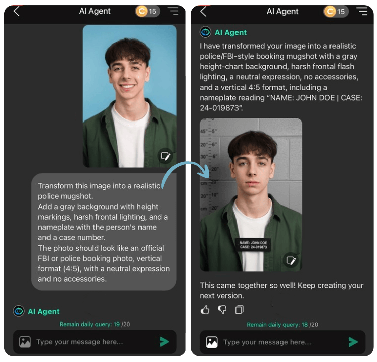 Paste the following prompt into the text box to guide the AI: "Transform this image into a realistic police mugshot.