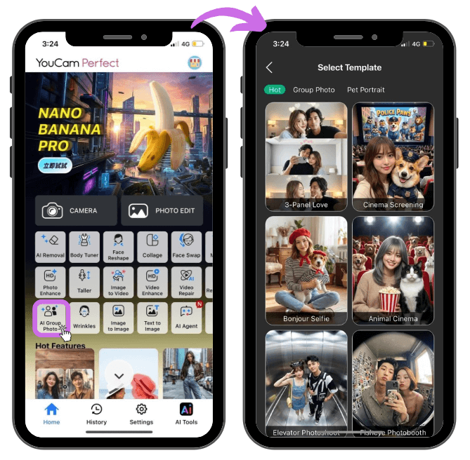 This app is a total game-changer. With its AI Group Photo feature, you can each take individual shots and merge them seamlessly.