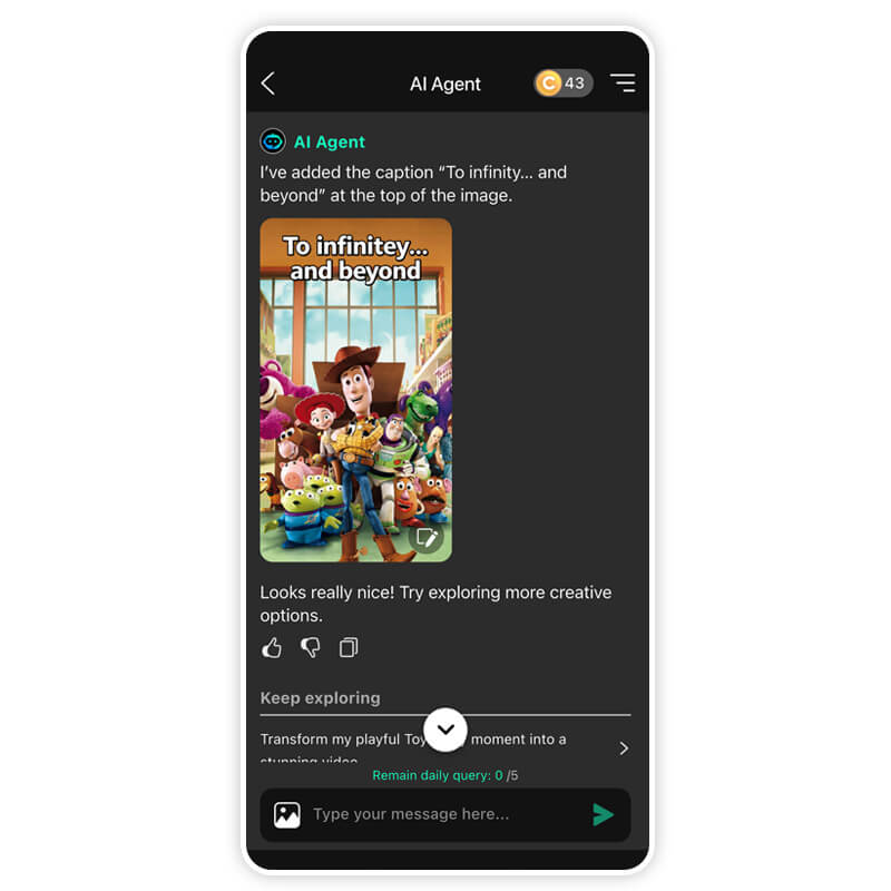 Upload your favorite Toy Story-themed photo. In the prompt box, tell the AI what you need.