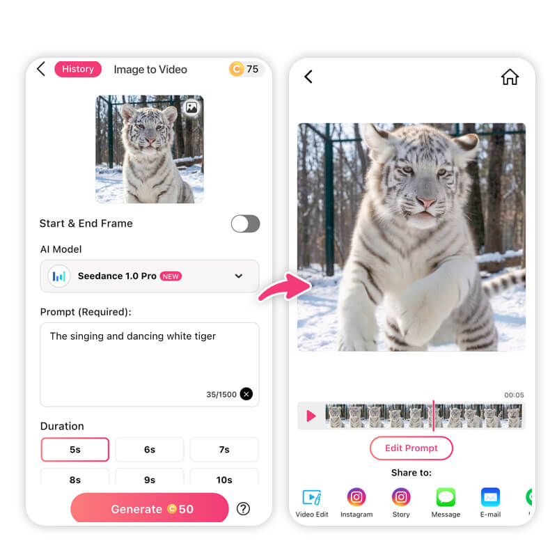 - Generate & Save: Watch your creation move and share the video on social media!