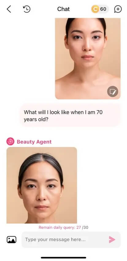 - Generate: Tap send and let the AI agent process your features to create your aged portrait in seconds.