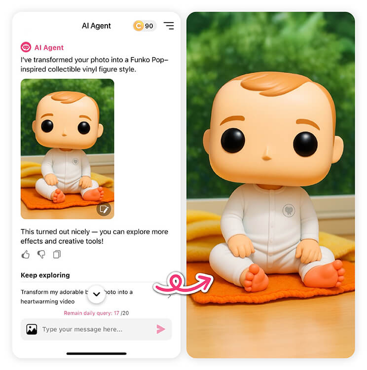 Tap generate and wait a few seconds. The AI Agent will transform your photo into a Funko Pop–style character with signature oversized proportions.