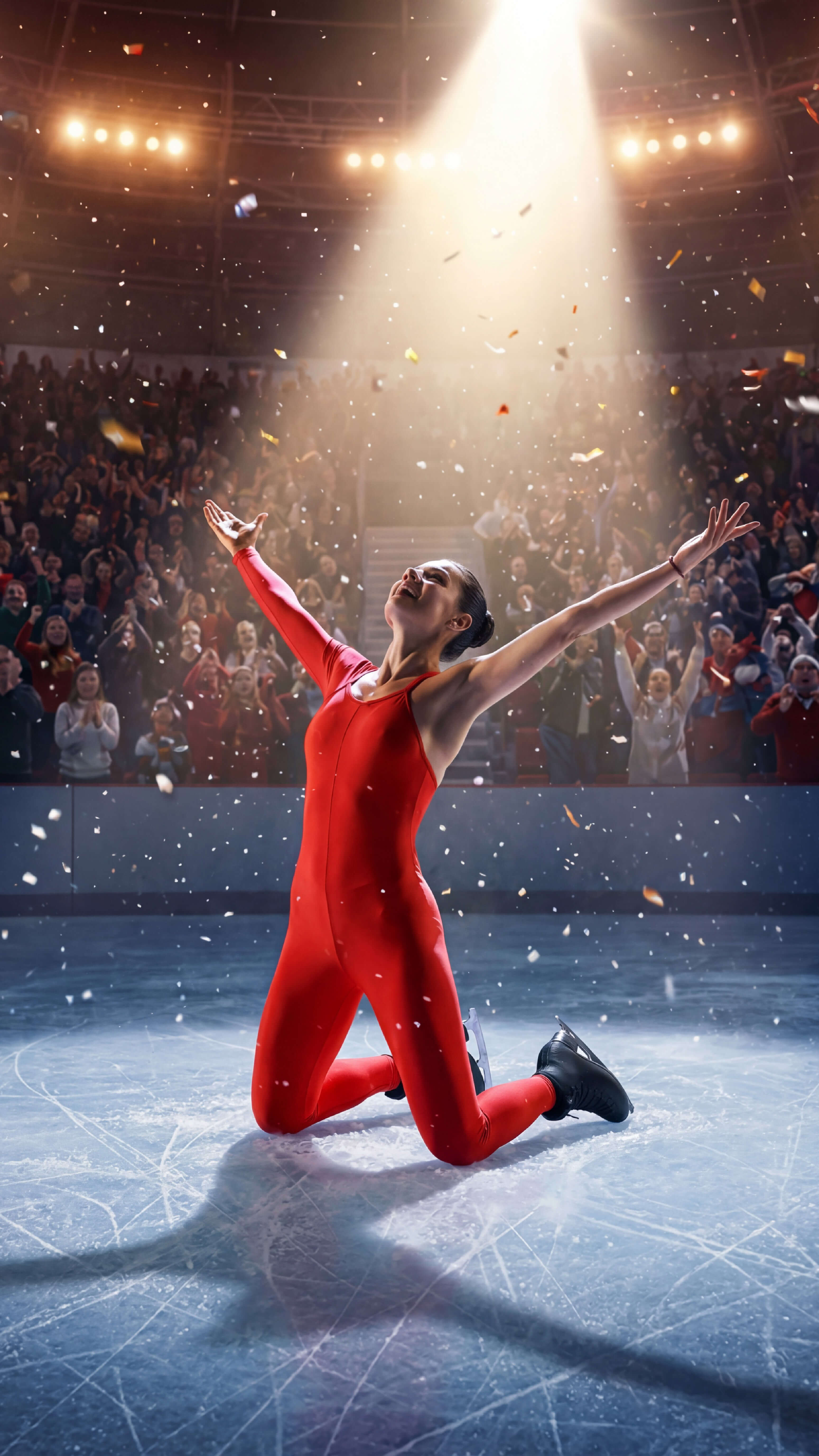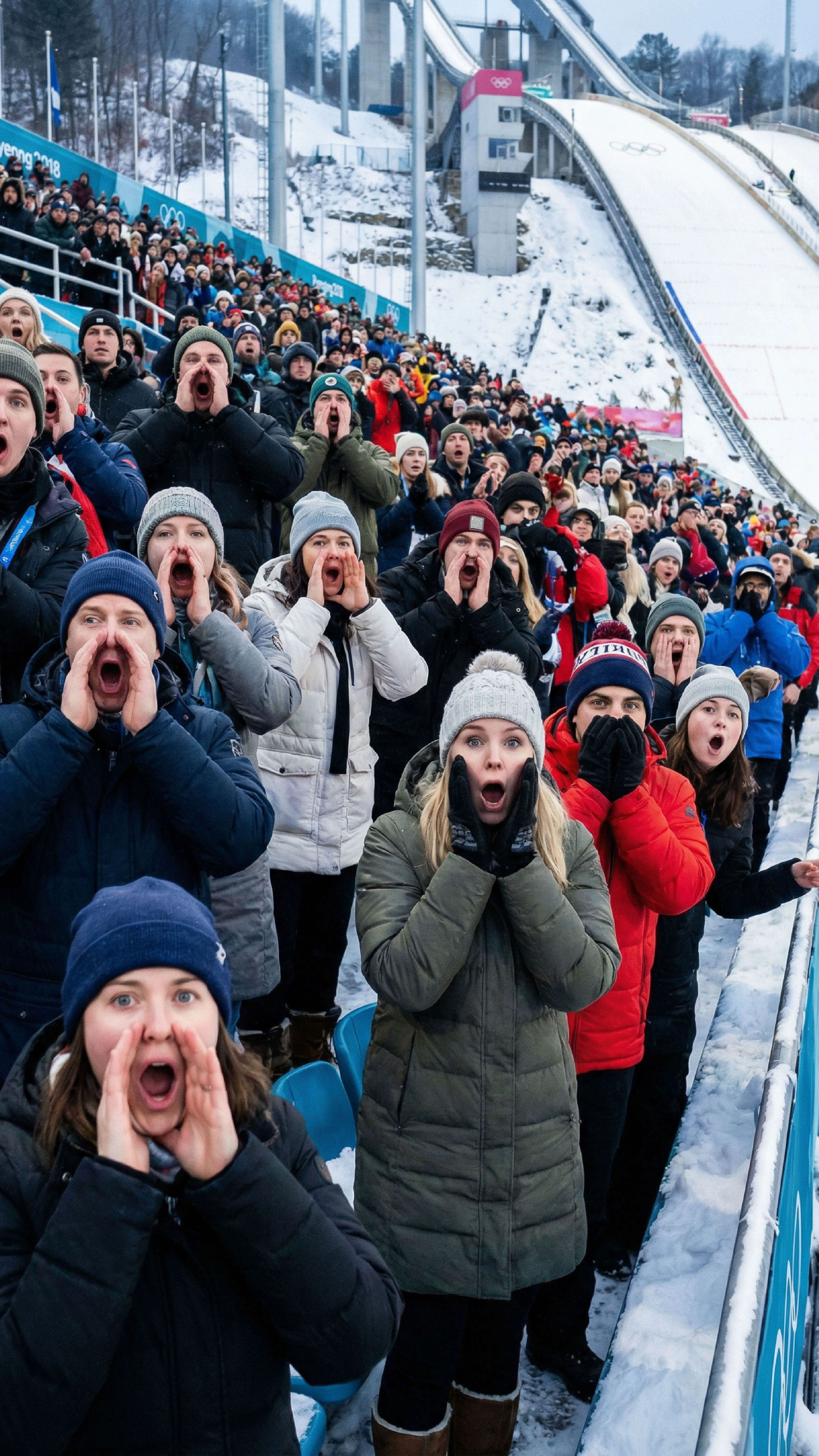 5. A packed winter Olympics stadium at night, glowing lights, snow falling, and cheering crowds captured from a wide-angle perspective