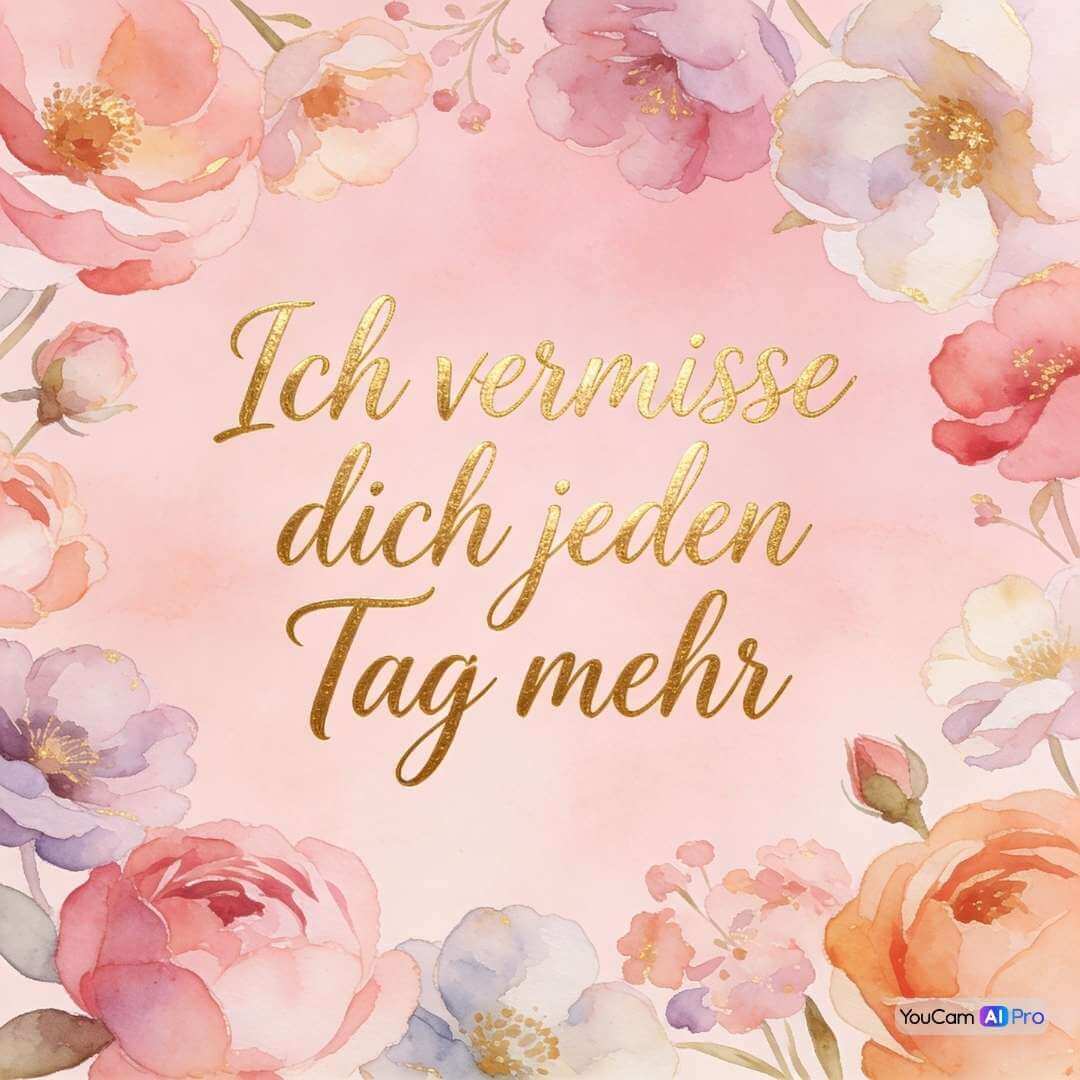 - Text "Ich vermisse dich jeden Tag mehr" in goldener Kalligraphie, rosa Hintergrund mit Aquarell-Blumen, luxuriös