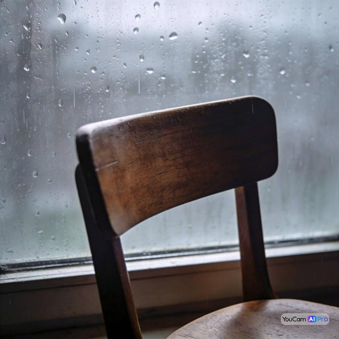 - Leerer Stuhl vor Fenster mit Regentropfen, graue Atmosphäre, einsam, melancholisch, fotorealistisch