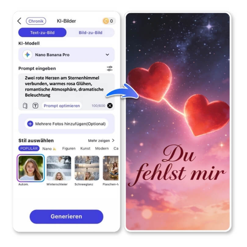 Beispiel-Prompt: "Zwei rote Herzen am Sternenhimmel verbunden, warmes rosa Glühen, romantische Atmosphäre, dramatische Beleuchtung"