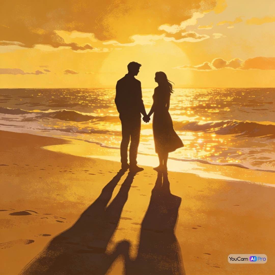 - Silhouetten von Paar hält Händchen bei Sonnenuntergang am Strand, warmes goldenes Licht, romantisch, dramatisch