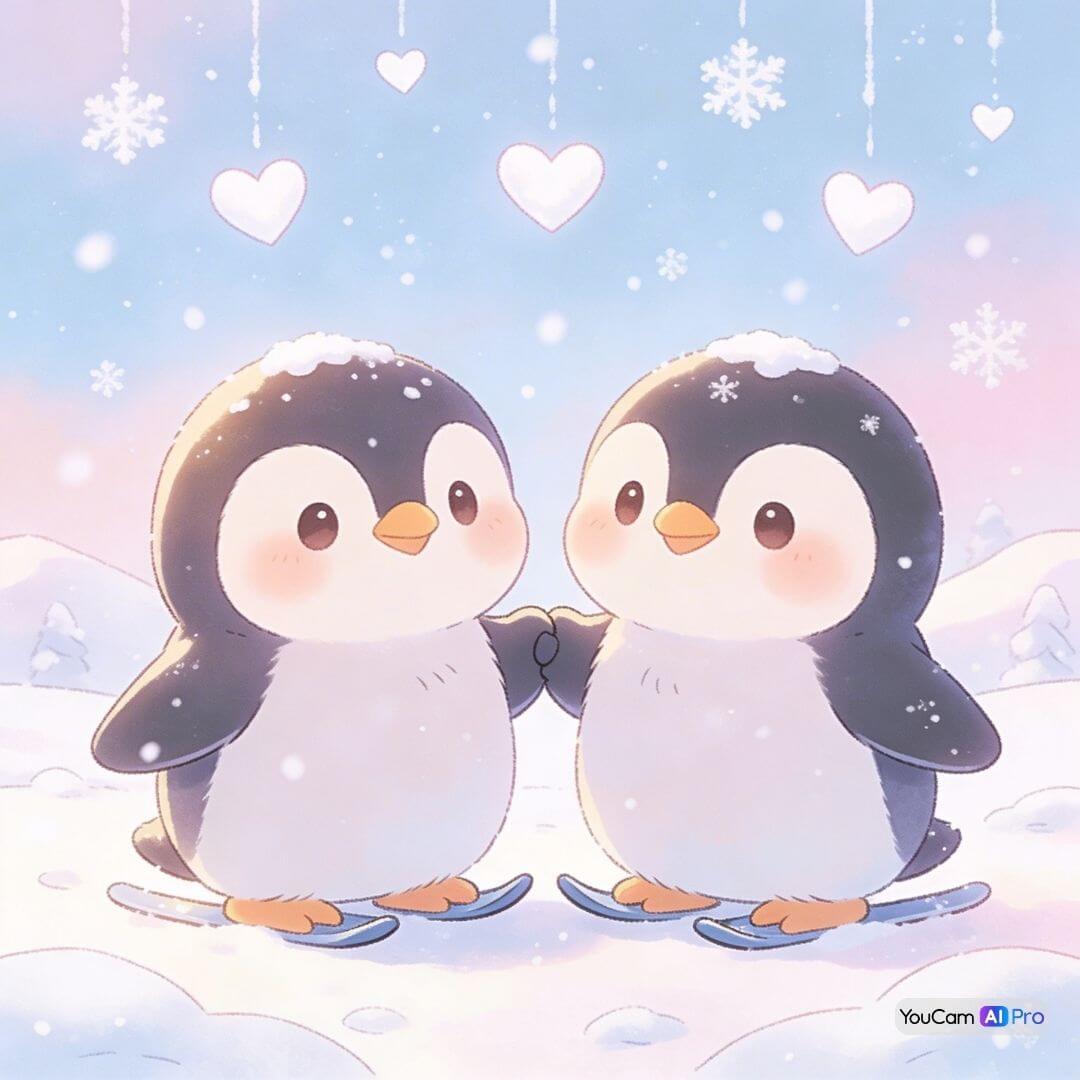- Zwei Cartoon-Pinguine halten Flossen, verschneite Landschaft, herzförmige Schneeflocken, süß, pastellfarben