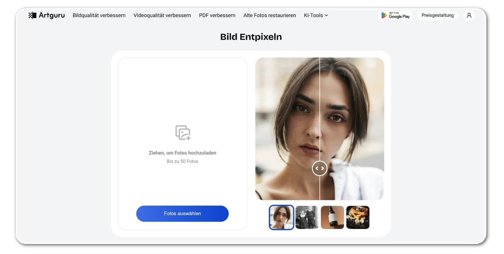 Artguru bietet einen KI-gestützten Bildverbesserer, der besonders bei der Restaurierung alter oder beschädigter Fotos punktet. Das Tool kombiniert Entpixelung mit allgemeiner Bildaufwertung und arbeitet komplett im Browser ohne Registrierungspflicht.