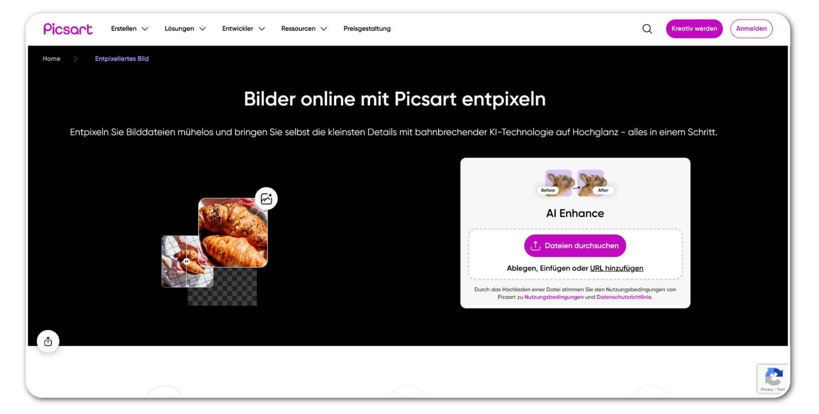 Picsart ist eine weit verbreitete Kreativplattform, die neben umfangreichen Design-Tools auch eine KI-Entpixelungsfunktion bietet. Besonders nützlich: Picsart erlaubt das Entpixeln mehrerer Bilder gleichzeitig (Batch-Verarbeitung von bis zu 50 Bildern) und ist damit eine effiziente Wahl für Creator oder kleine Unternehmen.