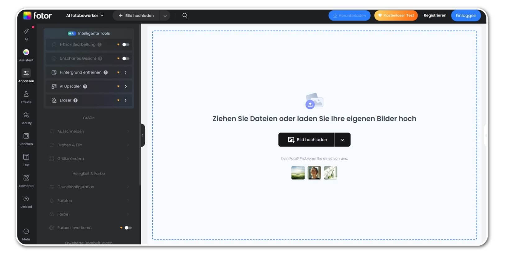 - Weitere Bearbeitungstools: Hintergrundentfernung, KI-Bildgenerator, Farbkorrektur