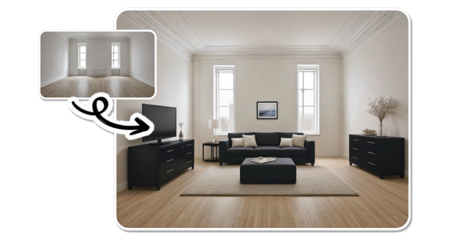 Deine Wohnung wirkt auf dem Foto etwas kahl? Markiere eine leere Wand und gib "ein abstraktes Gemälde in kühlen Farben" ein. Oder markiere eine Ecke auf dem Boden und füge einen "modernen Schrank" hinzu.