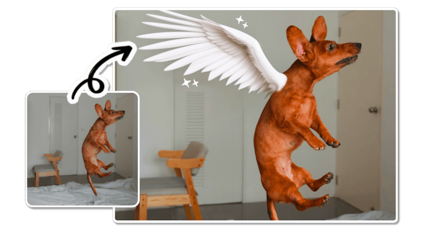 Hier wird es richtig kreativ! Nimm ein Foto von deinem Haustier, markiere seinen Rücken und gib "weiße Flügel" ein. Oder füge einem Landschaftsbild einen "fliegenden Drachen am Himmel" hinzu. Deiner Fantasie sind keine Grenzen gesetzt.