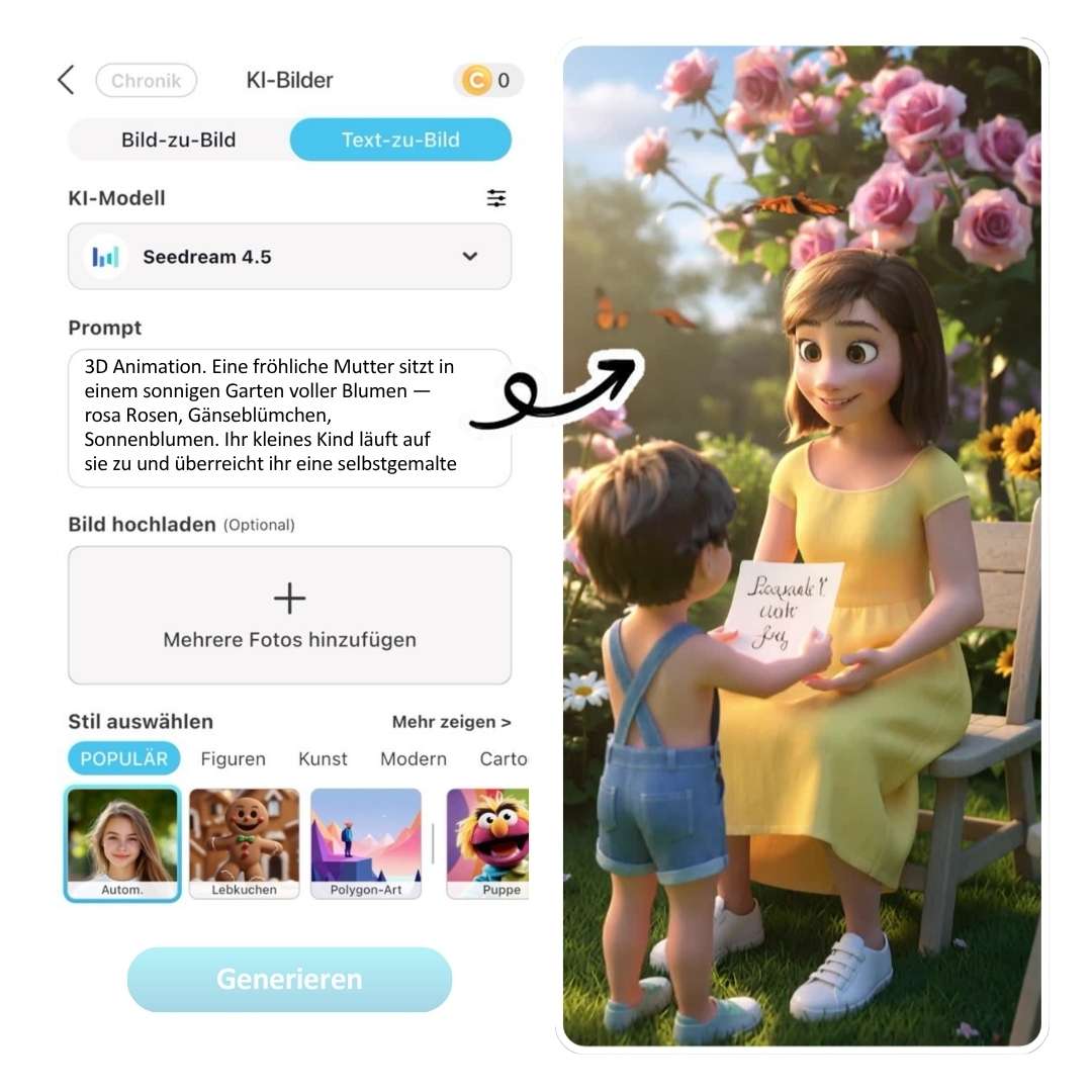 🌻 Garten-Überraschung: „Pixar 3D Animation. Eine fröhliche Mutter sitzt in einem sonnigen Garten voller Blumen – rosa Rosen, Gänseblümchen, Sonnenblumen. Ihr kleines Kind läuft auf sie zu und überreicht ihr eine liebevoll gemalte Karte. Die Mutter strahlt vor Freude und nimmt das Kind in eine innige Umarmung. Warmes Nachmittagslicht, weiche Schatten, Schmetterlinge im Hintergrund. Kamera startet weit und zoomt langsam in die Umarmung. 10 Sekunden."