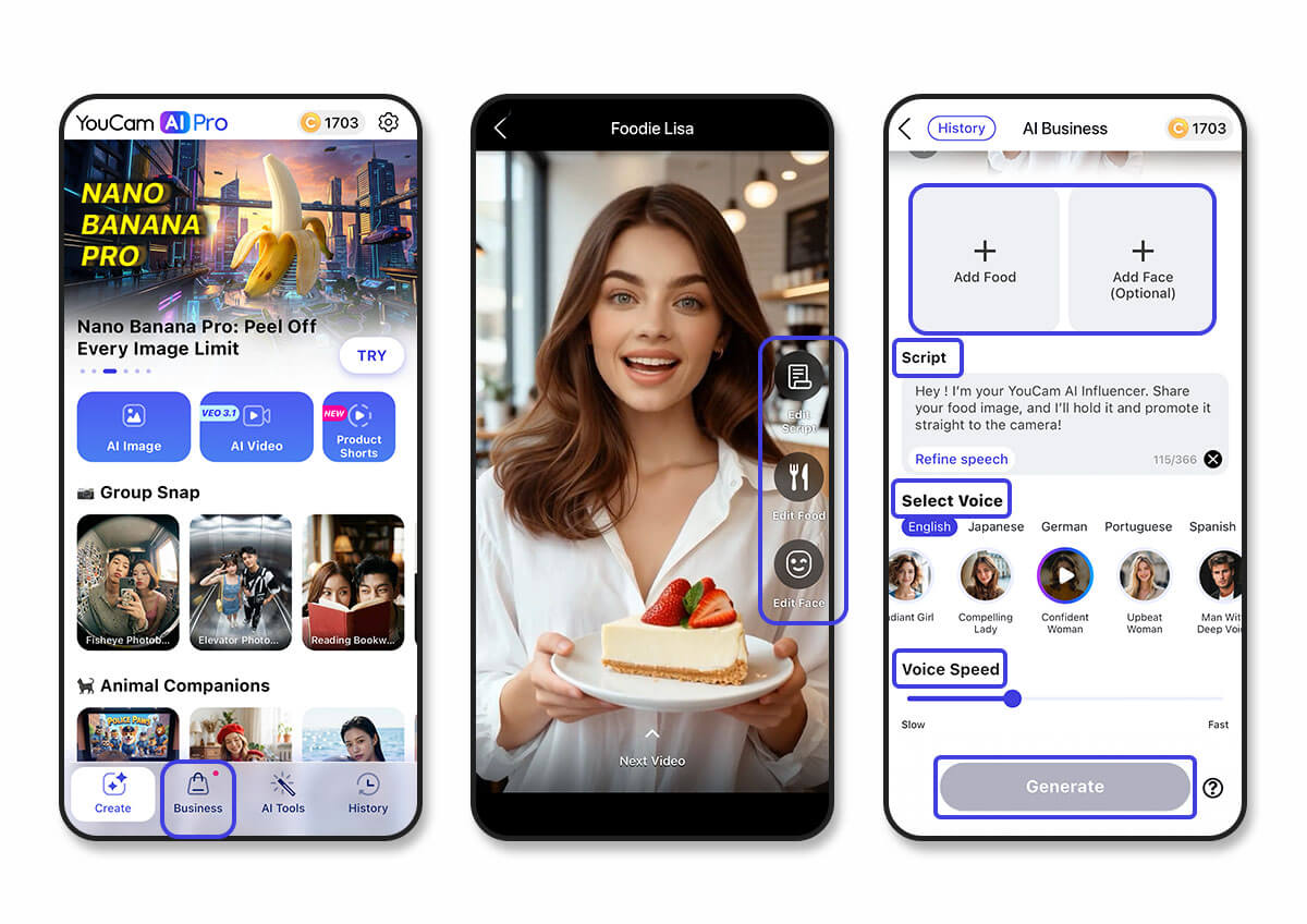 La era de los largos calendarios de producción y las costosas colaboraciones con influencers está siendo transformada por la IA. Con el generador de influencers con IA de YouCam AI Pro, marcas y creadores pueden generar ahora impactantes videos de producto de forma rápida y rentable, amplificando su alcance e impacto en redes sociales.