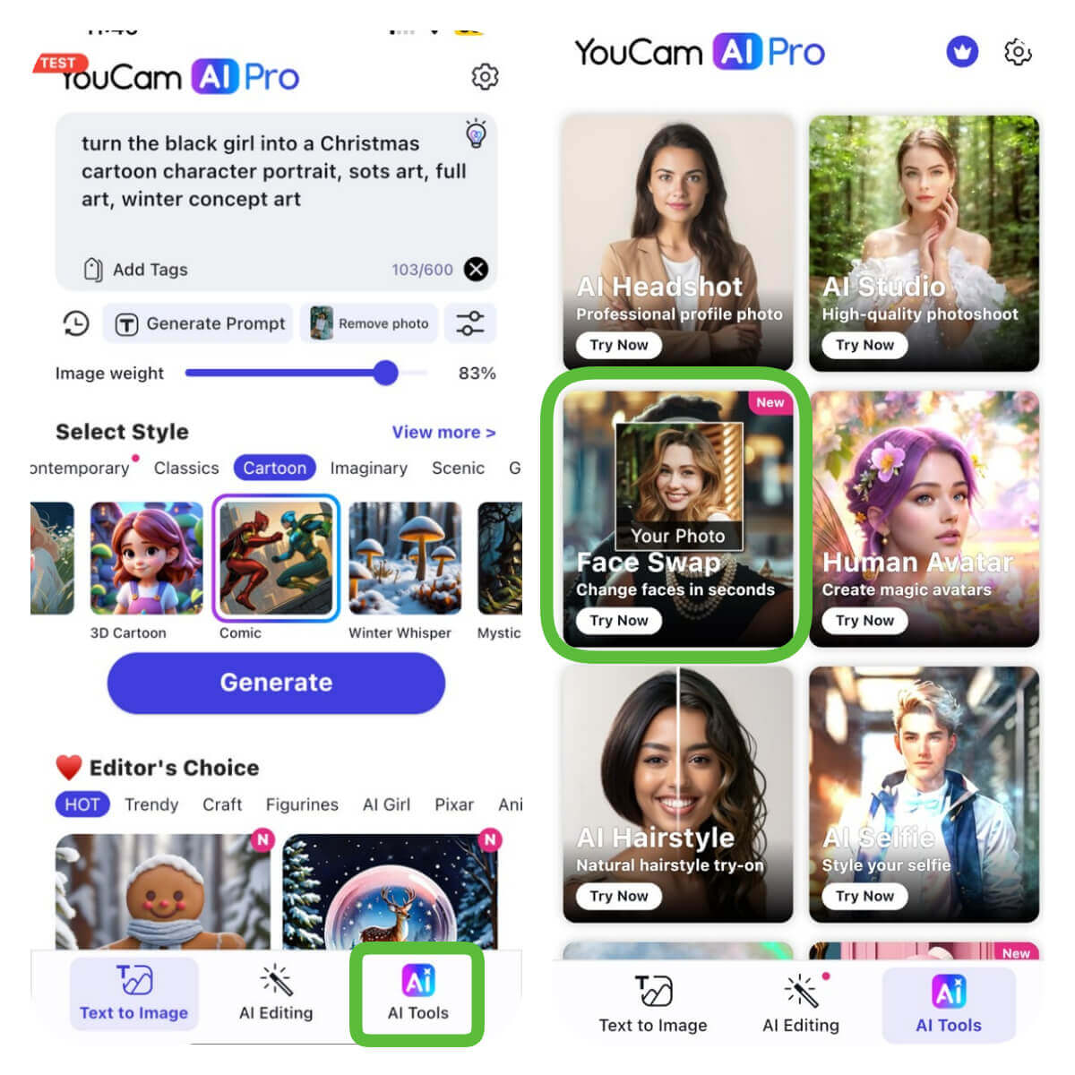 - AI Face Swap: Navigate to the AI face swap feature under the AI Tools section.