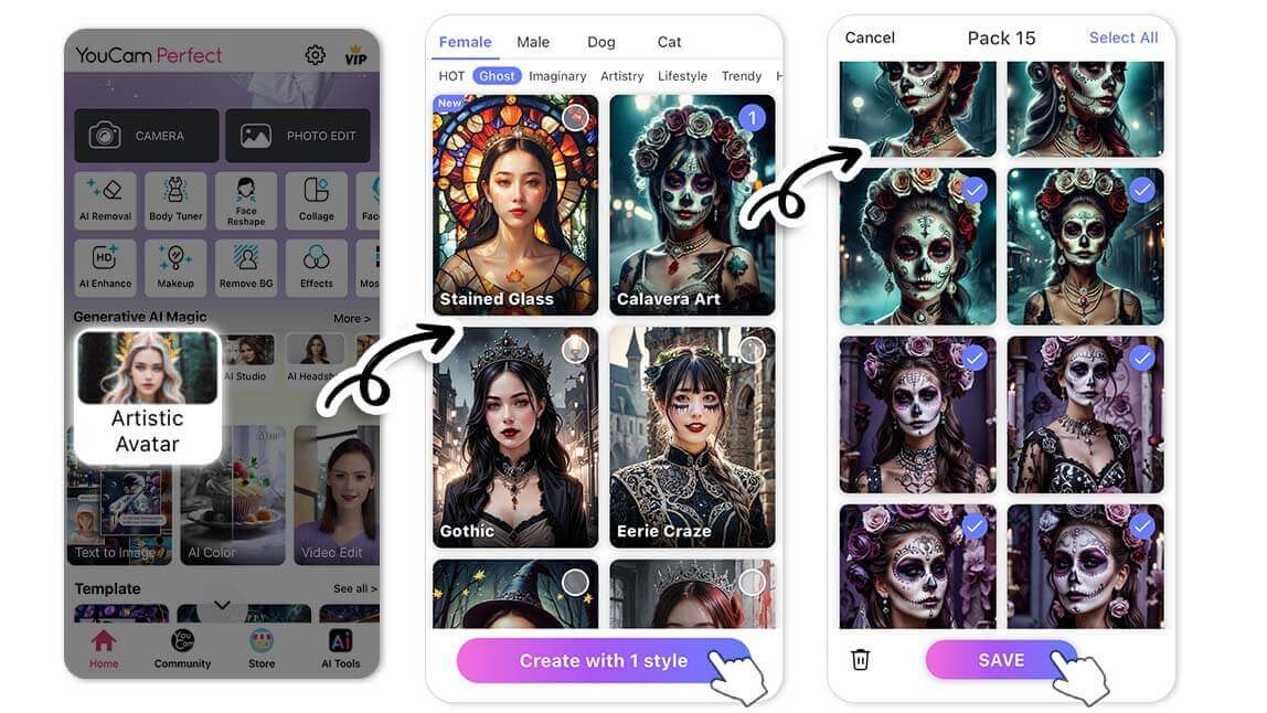 YouCam Perfect no es sólo un editor de fotos, sino también un generador de AI. La función Avatar Artístico permite a los usuarios crear varios tipos de avatares incluyendo estilos de Halloween, ¡lo que significa que puedes generar avatares con aspecto de esqueleto!