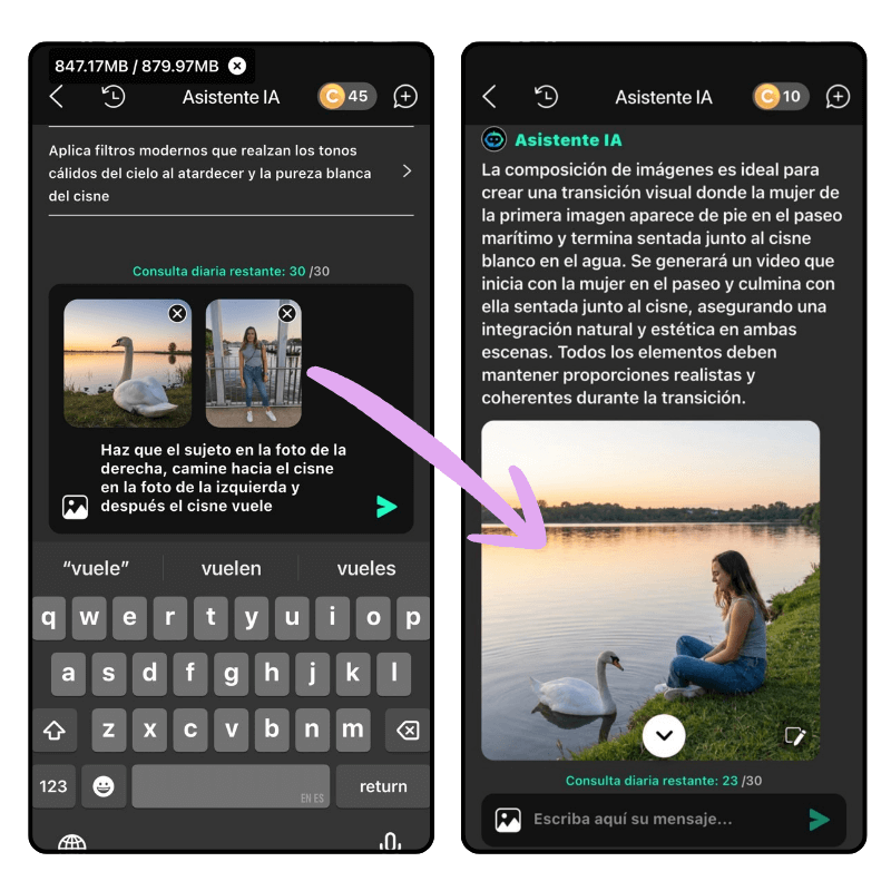 " Haz que el sujeto en la foto de la derecha, camine hacia el cisne en la foto de la izquiera y despues el cisne vuele "