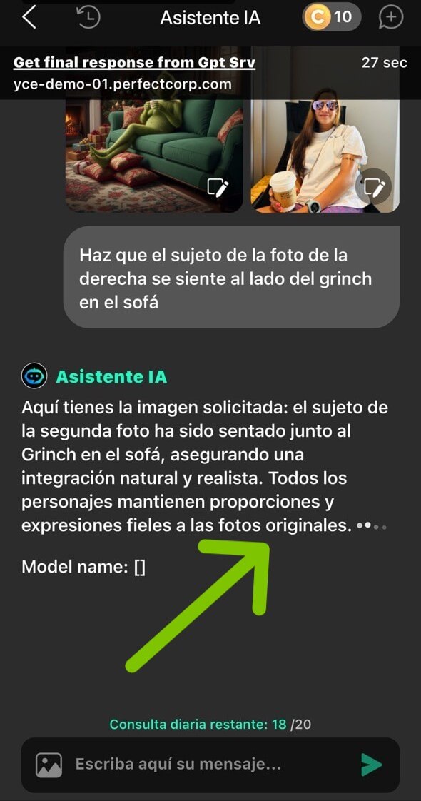 Lo que me gusta de esta app es que le puedes poner un prompt super simple como este: "haz que el sujeto de la derecha se siente al lado del Grinch en el sofa" y no nececistas decirle que 'no cambie los rasgos fisicos de las caras' o 'que deje las caras como las fotos' porque su inteligencia artificial es demasiado potente que sabe esto y hasta lo dice cuando esta creando las imagenes...