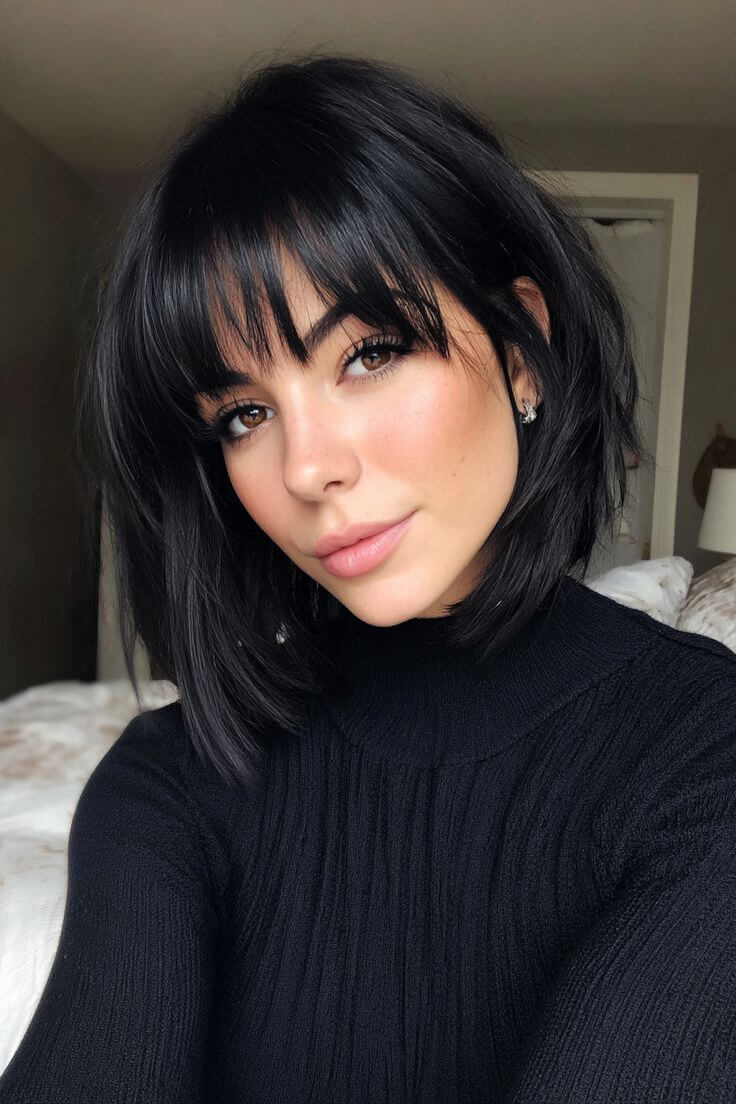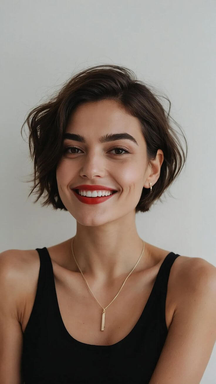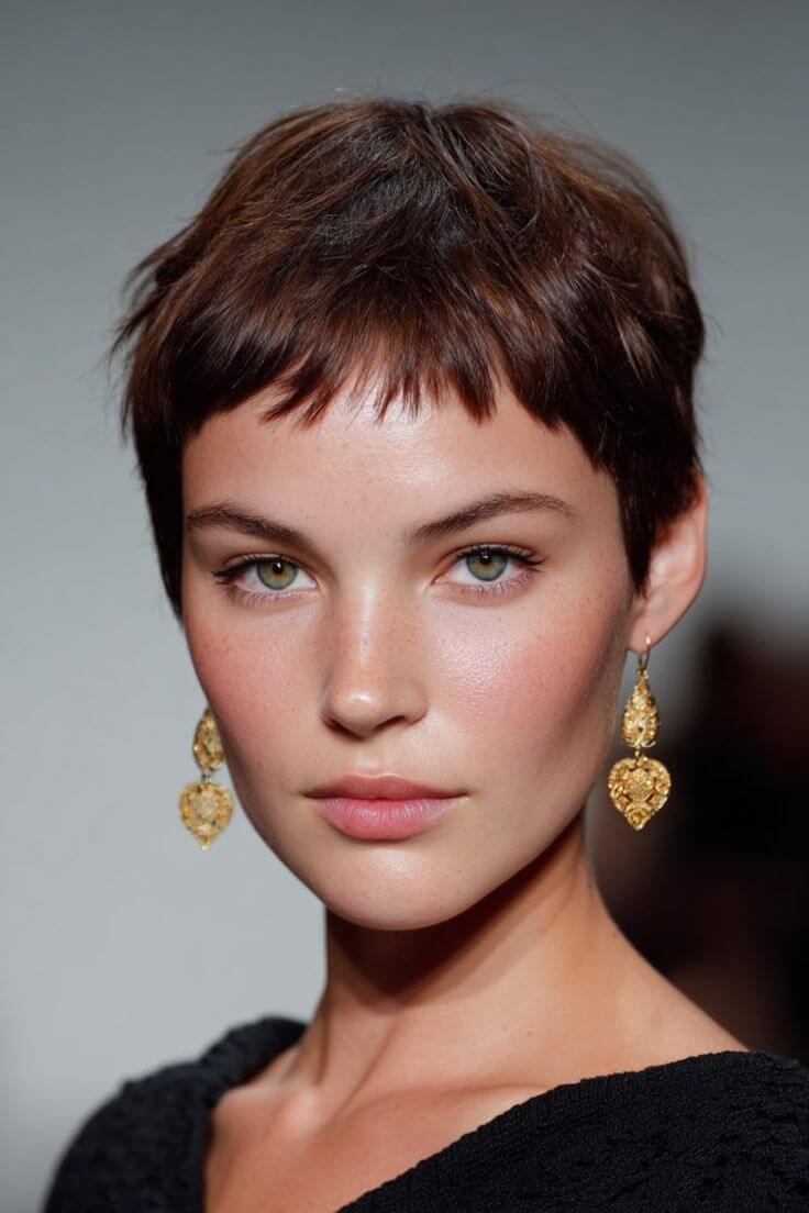 Une frange peut transformer une simple coupe courte en véritable sculpture. Elle est essentielle pour de nombreuses coupes courtes avec frange pour visages ronds.