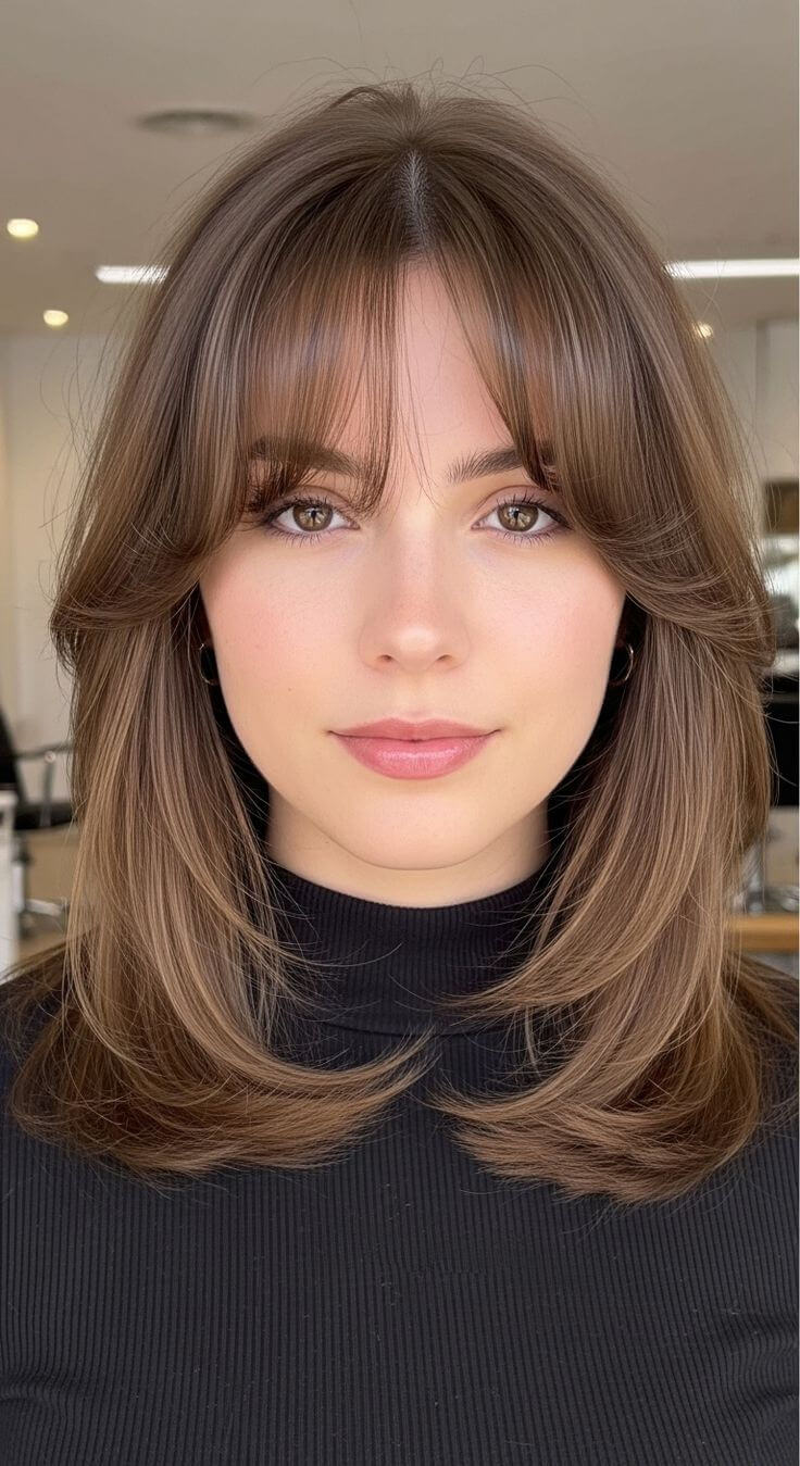 Évitez les franges lourdes et droites qui enferment le visage. Des mèches légères ajoutent de la douceur.