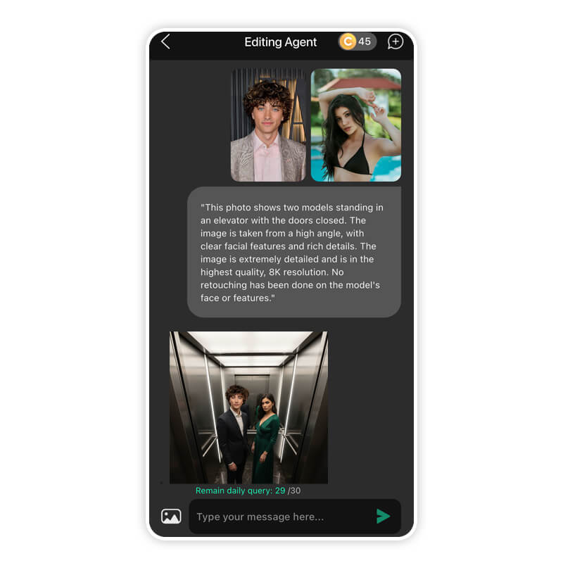 Laisse l’IA faire son travail ! En quelques instants, ta photo se transformera en une scène IA d’ascenseur stylée.
