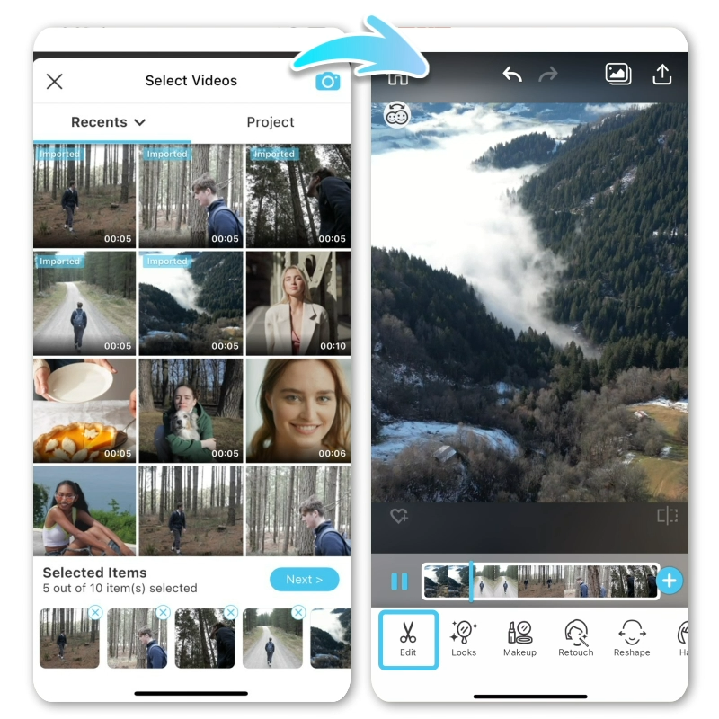 Ouvrez YouCam Video et sélectionnez les clips vidéo que vous souhaitez fusionner en un seul film depuis la galerie de votre téléphone.
