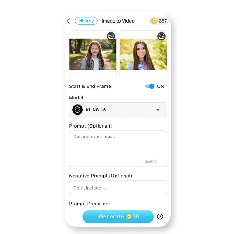 Pour créer une vidéo de vieillissement IA, utilisez l’outil « Image en vidéo » dans YouCam Video. Choisissez une photo d’enfance comme image de départ et une photo adulte comme image de fin, puis utilisez une invite simple comme « un enfant qui devient adulte » pour générer une progression d’âge fluide.