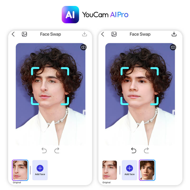 Fitur Face Swap di YouCam AI Pro memberi kamu kontrol yang sangat detail atas editan foto. Fitur ini mendeteksi setiap wajah di foto grup, sehingga kamu bisa memilih dengan tepat untuk swap yang akurat. Hasilnya berkualitas tinggi dan terlihat realistis, bahkan dengan pencahayaan atau sudut yang sulit. Kamu juga bebas memilih sumber foto, mulai dari selfie, foto selebriti, hingga gambar buatan AI. YouCam AI Pro membuat face swap jadi lebih mudah dan presisi, dengan hasil yang keren setiap saat.