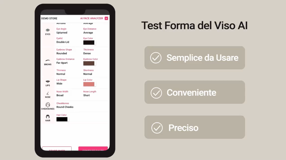 Riteniamo che l'utilizzo della tecnologia di virtual try on, insieme al face shape test per rilevazione forme del Viso AI, possa migliorare notevolmente l'esperienza di acquisto delle clienti. Questo non solo consente loro di ricevere consigli personalizzati sulle ciglia finte, ma permette anche di "provare" virtualmente diversi set di ciglia finte e di vedere come si adattano alla forma degli occhi. Le tue clienti avranno un'eccezionale possibilità di interagire con i tuoi prodotti tramite analisi forma del viso, forma degli occhi e virtual try on.