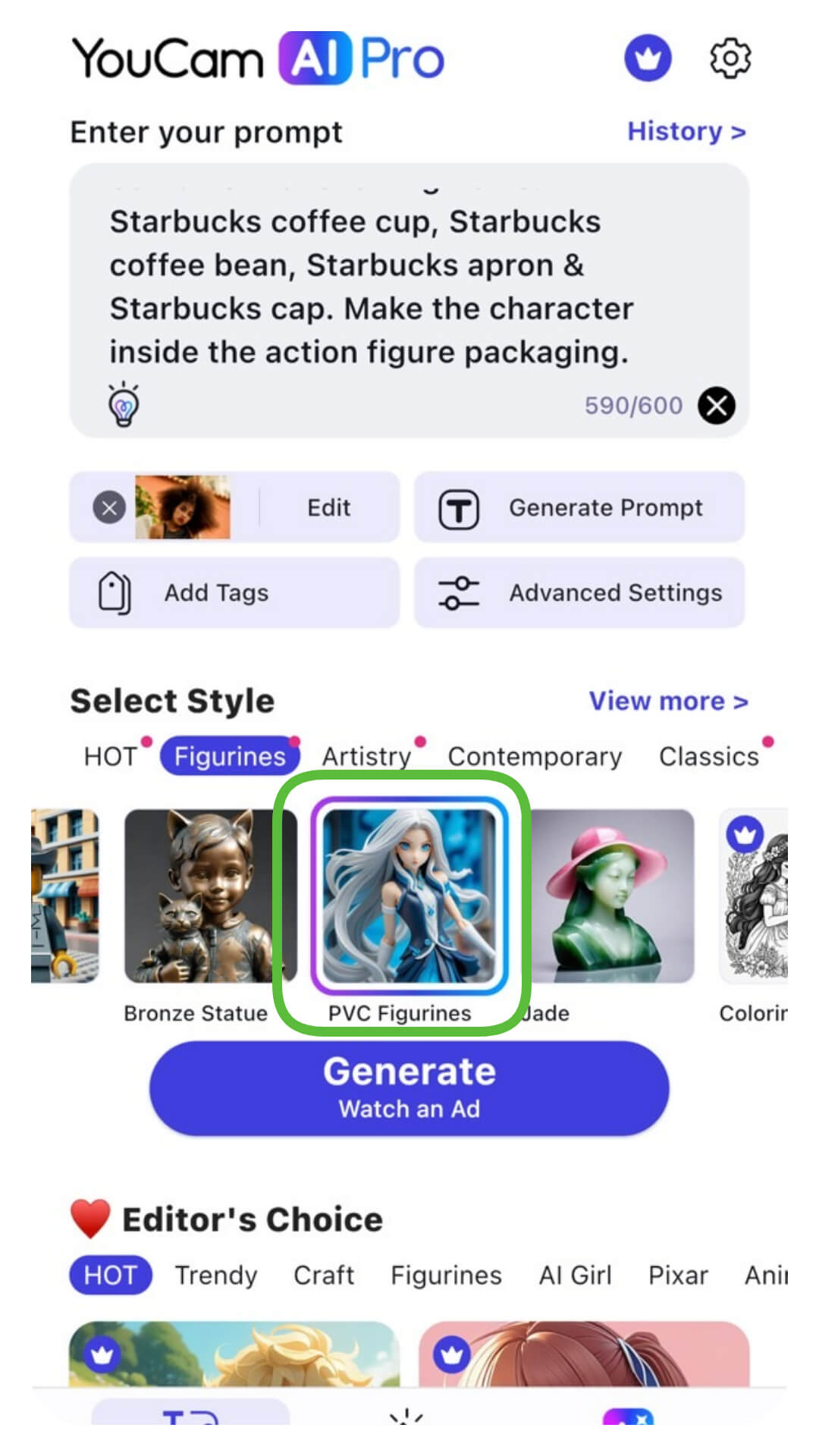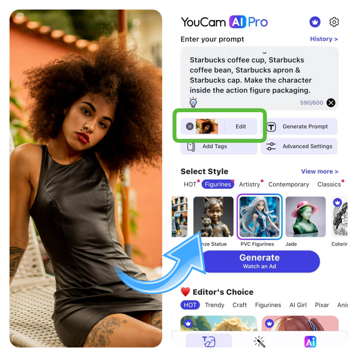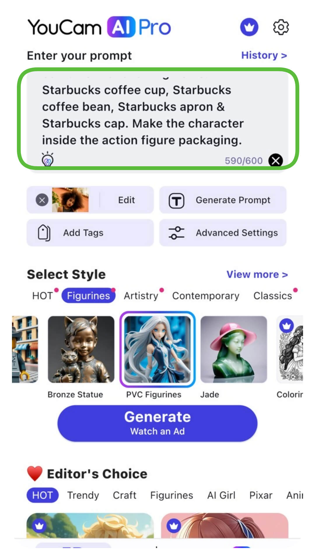 Come alternativa a ChatGPT gratis, YouCam AI Pro offre la generazione di immagini AI da testo, ideale per l'espressione creativa e in questo caso per creare action figure gratis. Il nostro generatore di immagini AI offre oltre 70 stili di arte AI, avatar AI e ritratti di animali domestici, che suggeriscono versatilità per creare action figure gratis. I passaggi da seguire sono: