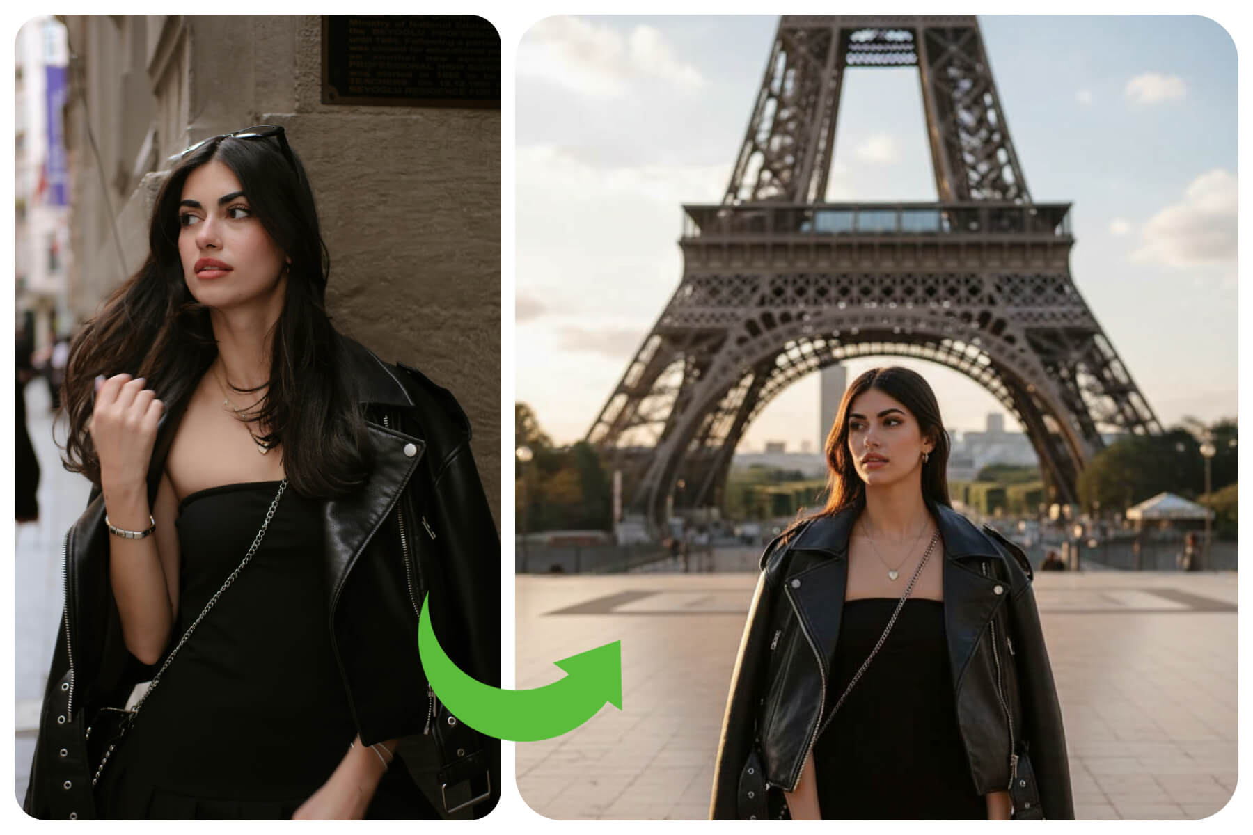 Posizionami sotto la Torre Eiffel con luci, ombre e prospettiva realistiche che danno l'impressione che io sia davvero lì.