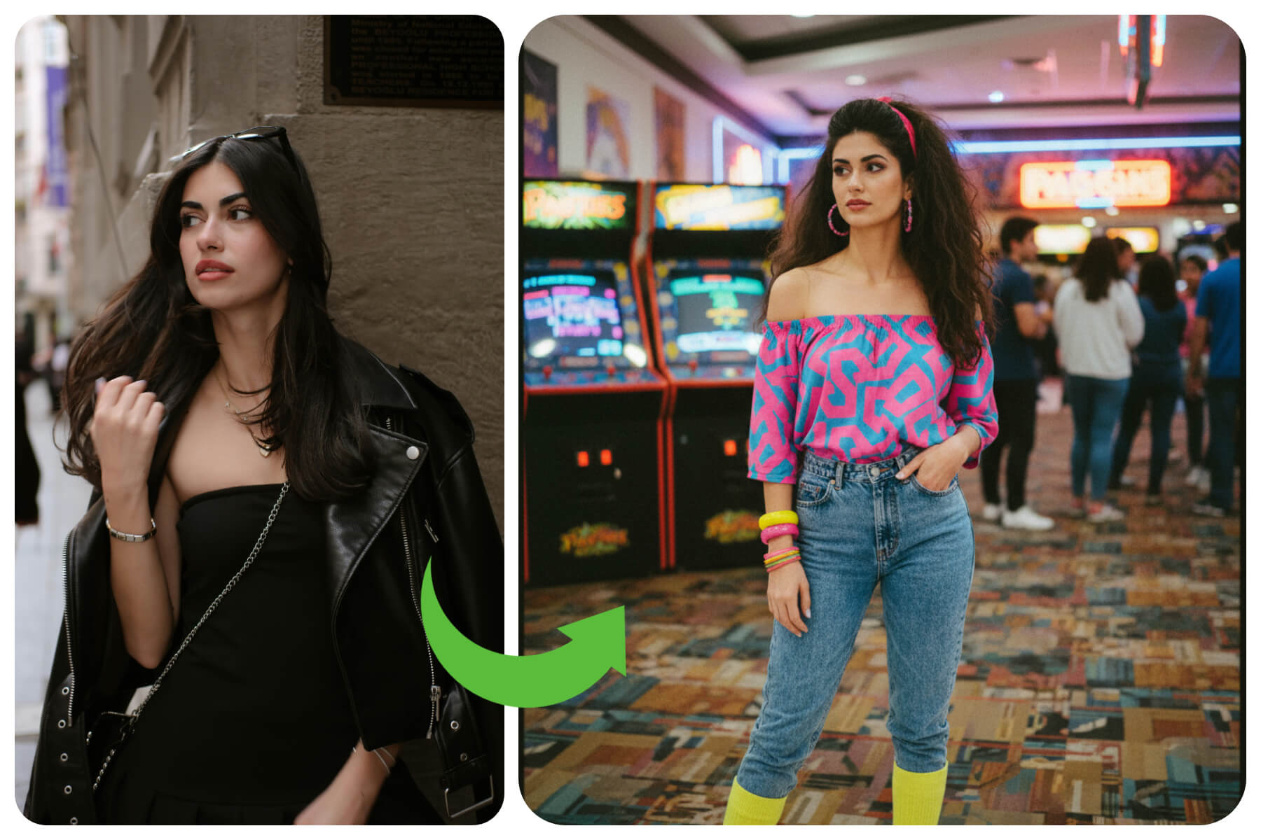 Prendi questa mia foto e trasformami in un personaggio degli anni '80, con capelli voluminosi, abiti dai colori fluo e una sala giochi retrò sullo sfondo. Aggiorna il mio abbigliamento, la mia acconciatura e lo sfondo in modo che corrispondano all'epoca. Fai in modo che sembri un ritratto autentico di quel decennio, con moda, colori e stile le accurati.