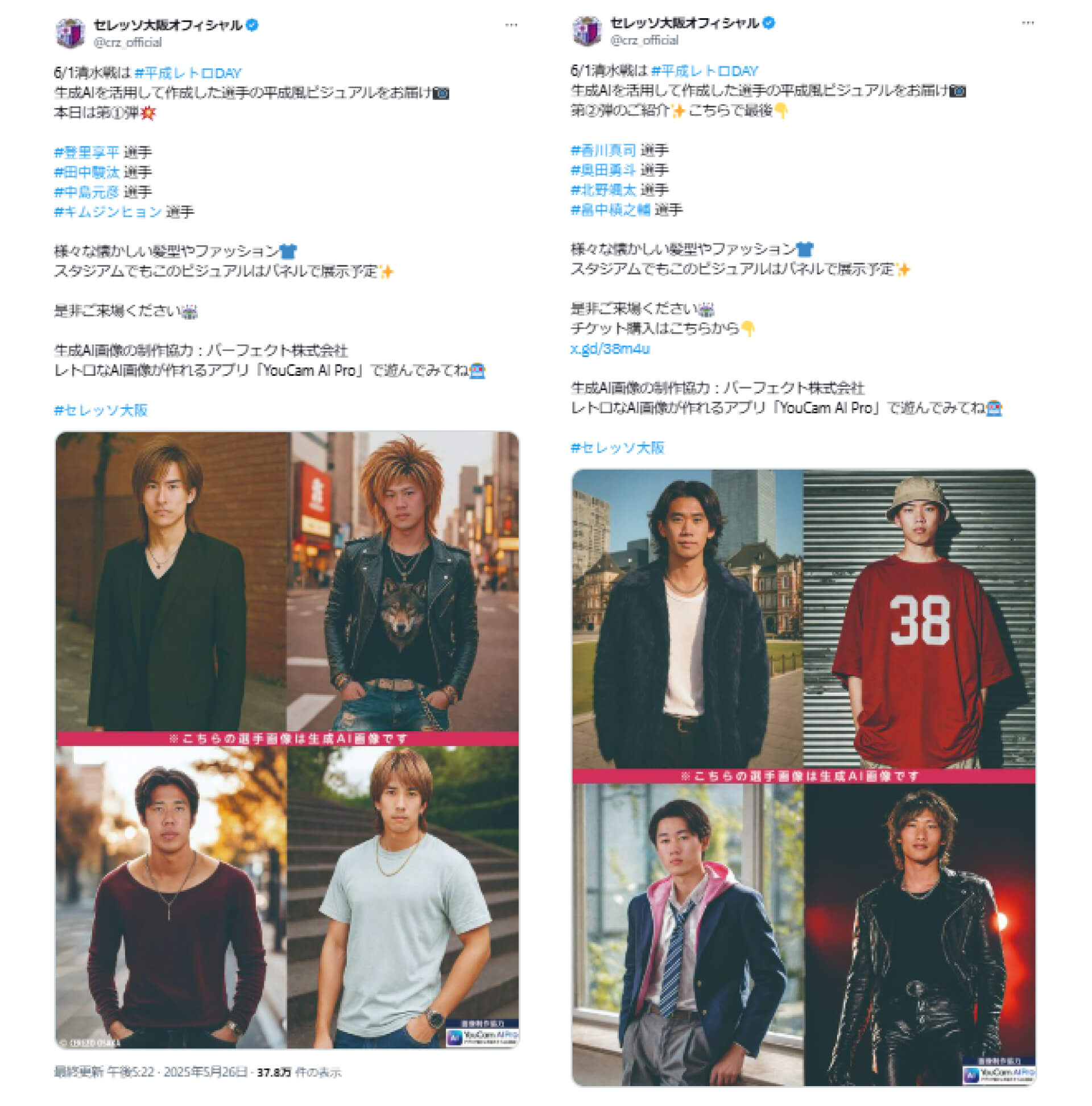 今回の「平成レトロDAY」では、パーフェクト社の生成AI技術を活用し、選手を平成風の髪型やファッションにアレンジしたビジュアルを制作しました。
