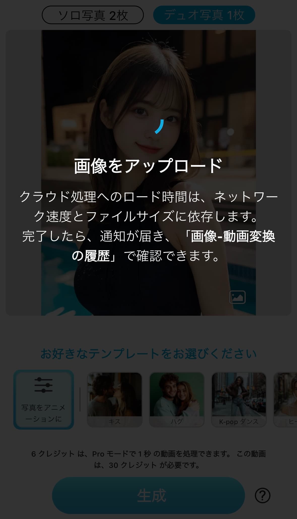 テンプレート以外の動きを追加したい場合は、【写真をアニメーションに】機能をタップすると、日本語テキストで画像をどのように動かしたいかを指定することも可能です。