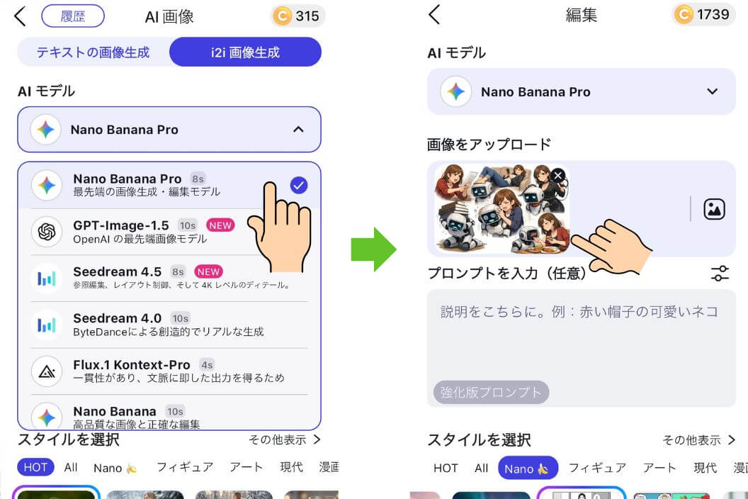 【AIモデル】は、画像をアレンジできるスタイルが豊富な「Nano Banana Pro」を選びます。