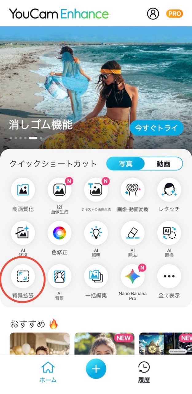 アプリのトップ画面から【AI背景拡張】をタップします。