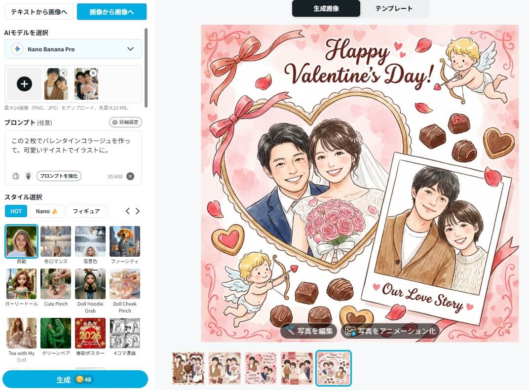 生成AIならではのイラスト化やアート風にすることで、他のサイトでは味わえないオリジナルなバレンタインコラージュが完成します。