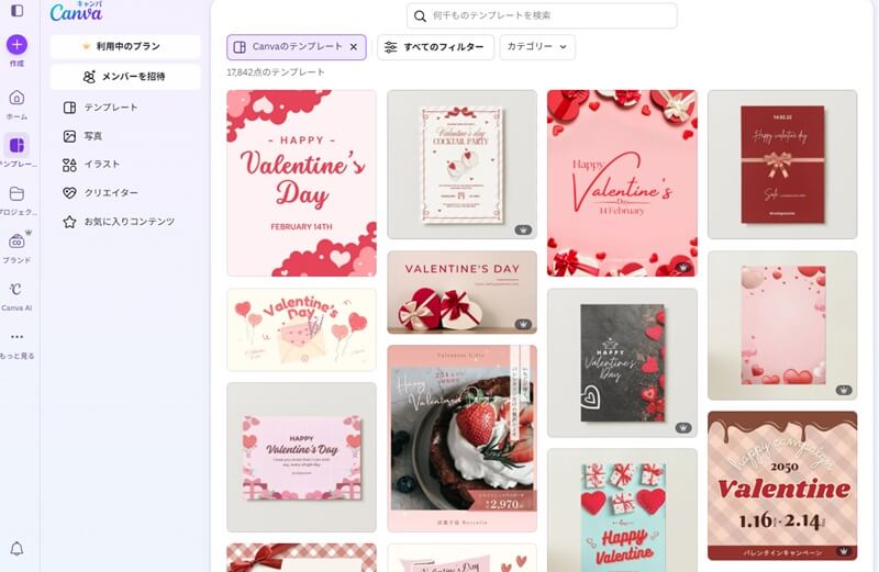『Canva』の魅力は、バレンタインのテンプレートが豊富に揃っていることです。