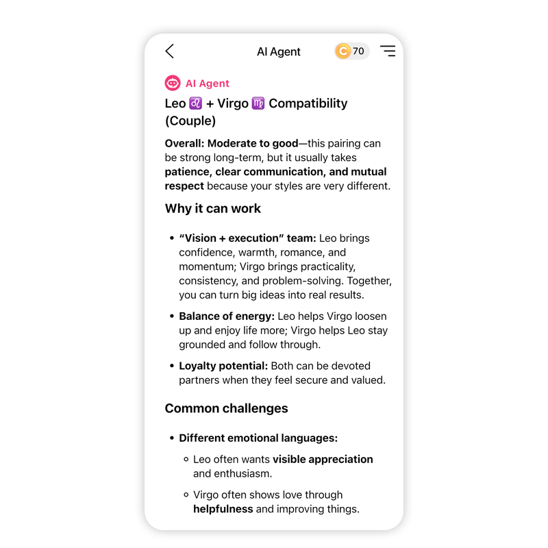 - 실시간 인터랙티브 대화: "우리가 더 잘 소통하려면 어떻게 해야 할까?" 또는 "우리 관계에서 주의해야 할 점은 뭐야?" 같은 구체적인 질문에도 AI가 즉각적인 인사이트를 제공합니다.