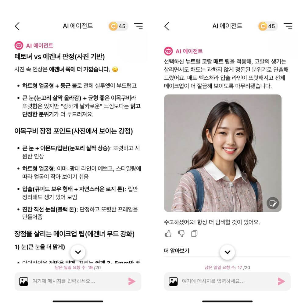 YouCam Makeup의 AI 에이전트는 사진 속 미세한 각도와 비율을 분석해 내 외모가 어느 쪽 무드에 가까운지 알려주는 똑똑한 가이드예요.