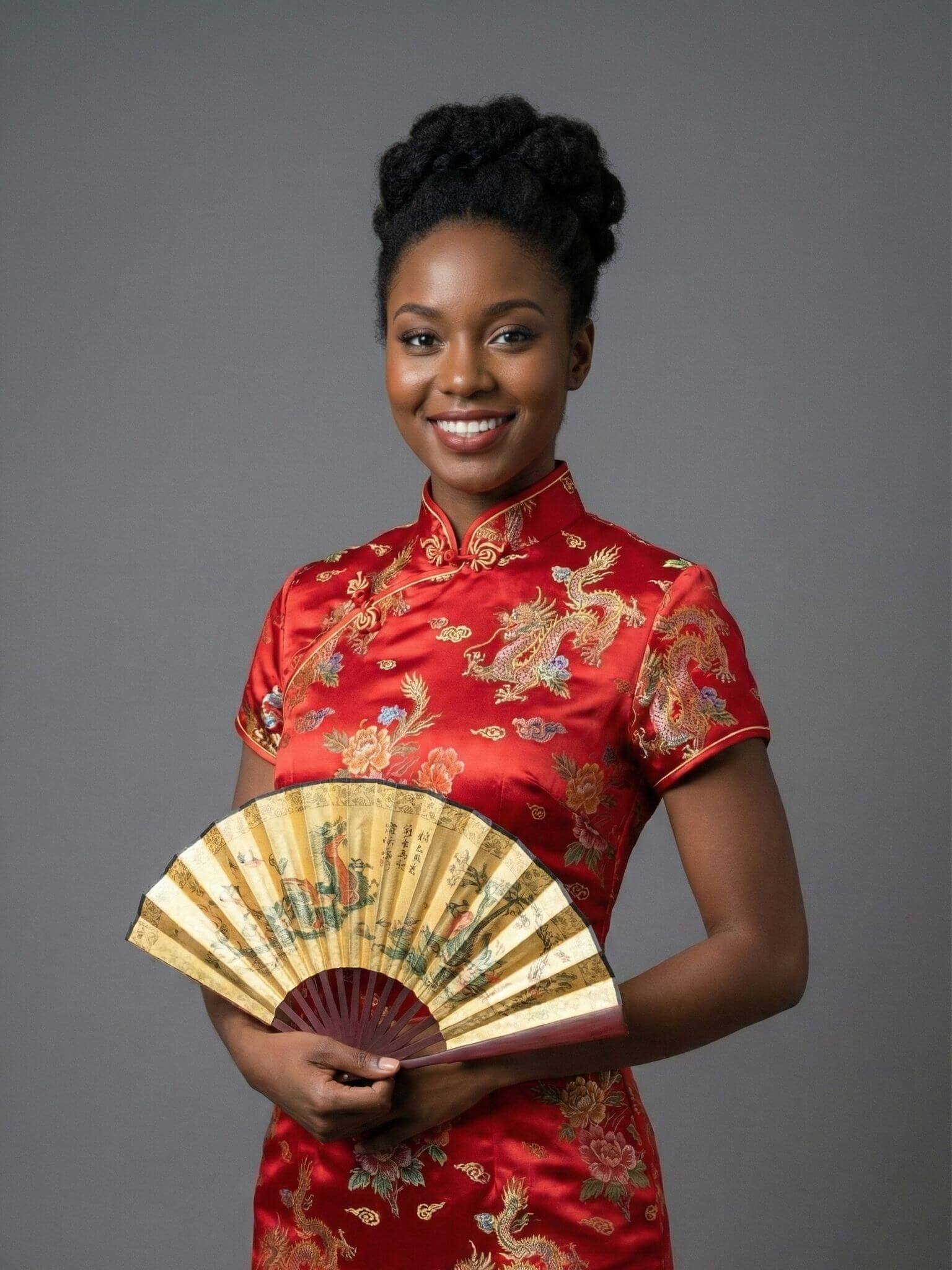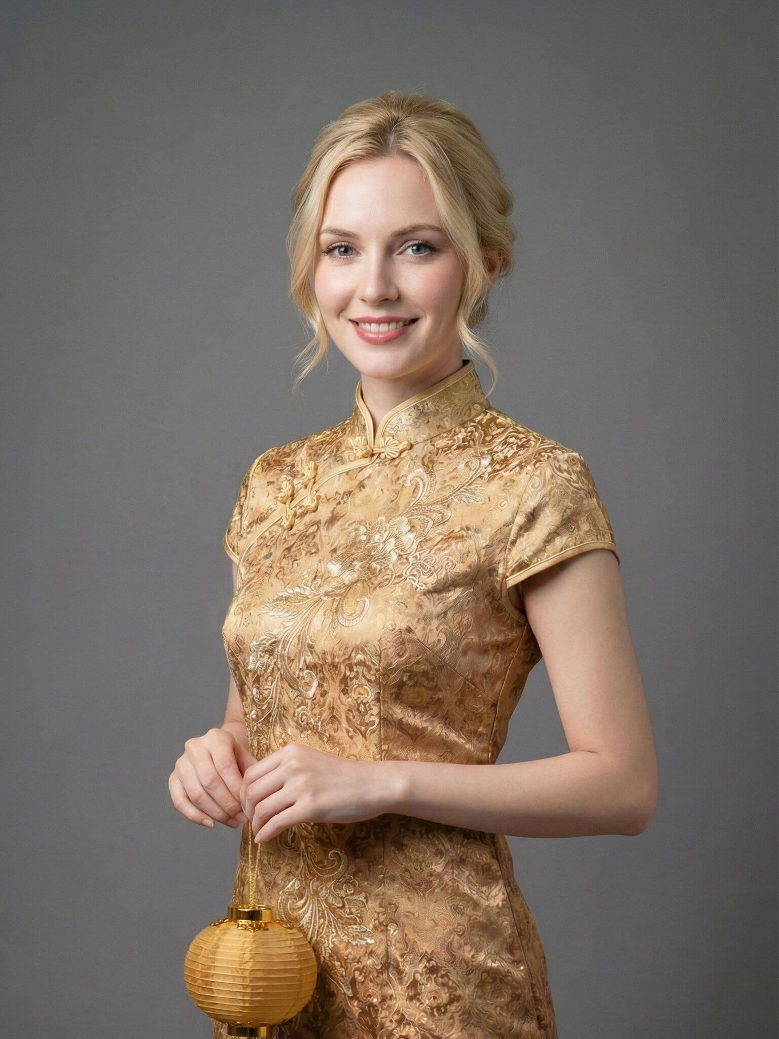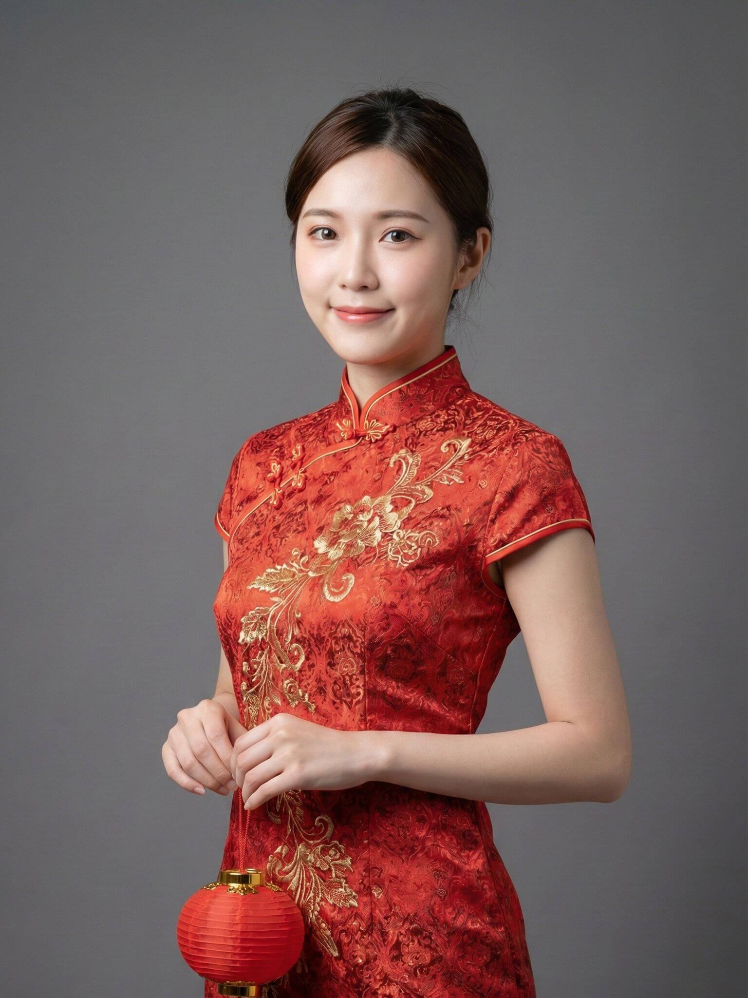 - O Qipao (também conhecido como Cheongsam) é um vestido tradicional chinês que valoriza a silhueta feminina, geralmente feito de seda e com gola alta. É uma das peças mais elegantes e populares para usar durante as celebrações do Ano Novo Lunar.